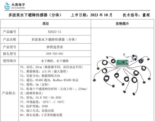 產(chǎn)品選型:綜上所述,經(jīng)和客戶、公司技術溝通交流后,產(chǎn)品選用制造商為:福州大禹電子科技有限公司定制生產(chǎn)的:分體式水下避障傳感器(10波束電路板),接4路探頭(和電路板做快插連接,200KHz探頭,每只探頭1.5米長線纜),電路板集成到水下機器人內(nèi)部做好防水封裝,配50米線纜,線纜從機器人頂部穿出來防水封裝,另一端做快插接頭和手持式顯示主機或電腦上位機軟件顯示出前、后、左、右分別的距離值和水下溫度;